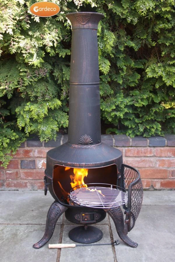- Metal chimeneas surfaces can become very hot in use and will burn the skin if touched. Burning temperatures inside steel and cast iron chimeneas are even higher than inside traditional cast iron chimeneas. Gardeco recommends the use of a chimenea guard when small children are present.